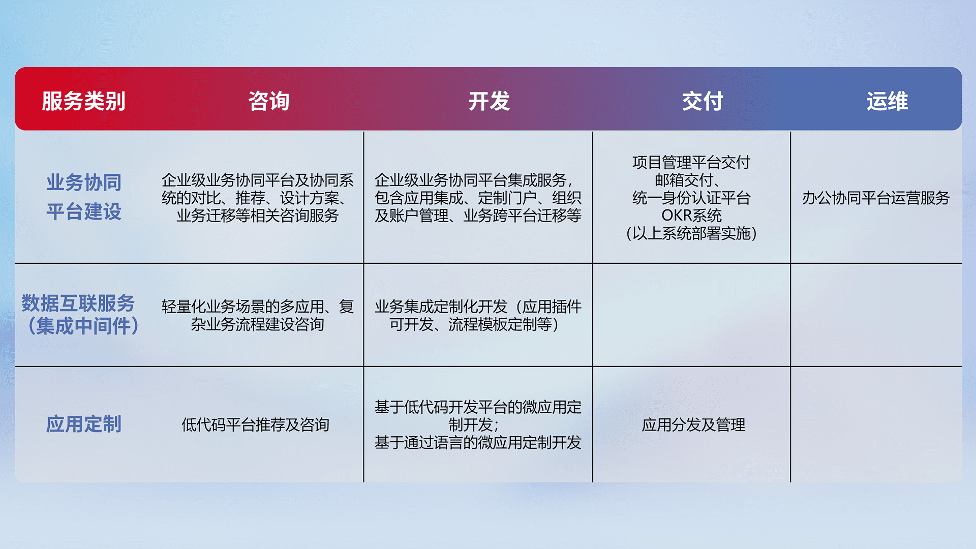 针对钉钉、、、企微、、、、IDaas等平台级产品提供产品的规划、、、方案、、交付、、、定制化开发等服务,,实现如统一协同办公、、、、智能客户服务、、混合会议管理、、、智能数据查询、、、等业务场景,,,,实现数字化转型。。