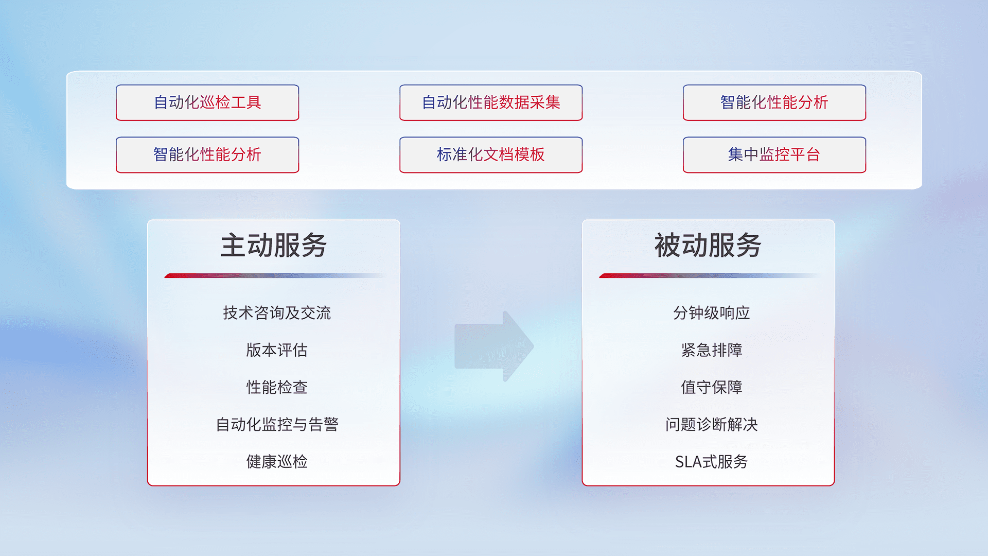 智能化工具和标准化文档,,,保障服务质量,,提供主动服务(包含技术咨询、、、、版本评估、、性能检查、、、、自动化监控与告警、、、健康巡检)和被动服务包含(分钟级响应、、、、紧急排障、、、值守保障、、、问题诊断解决、、、、SLA服务)。。。