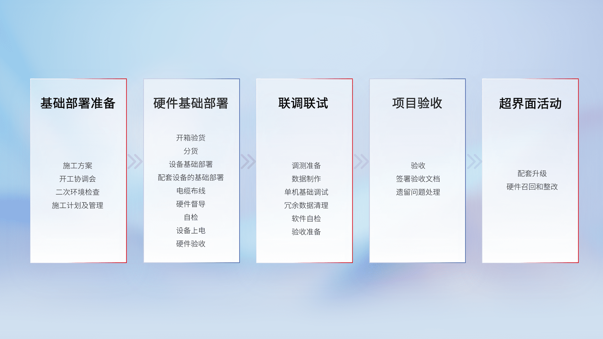 从基础部署准备、、、、硬件基础部署、、、、联调联试、、项目验收、、越界面活动的全过程可追溯,,,,保证施工质量和进度。。。。
