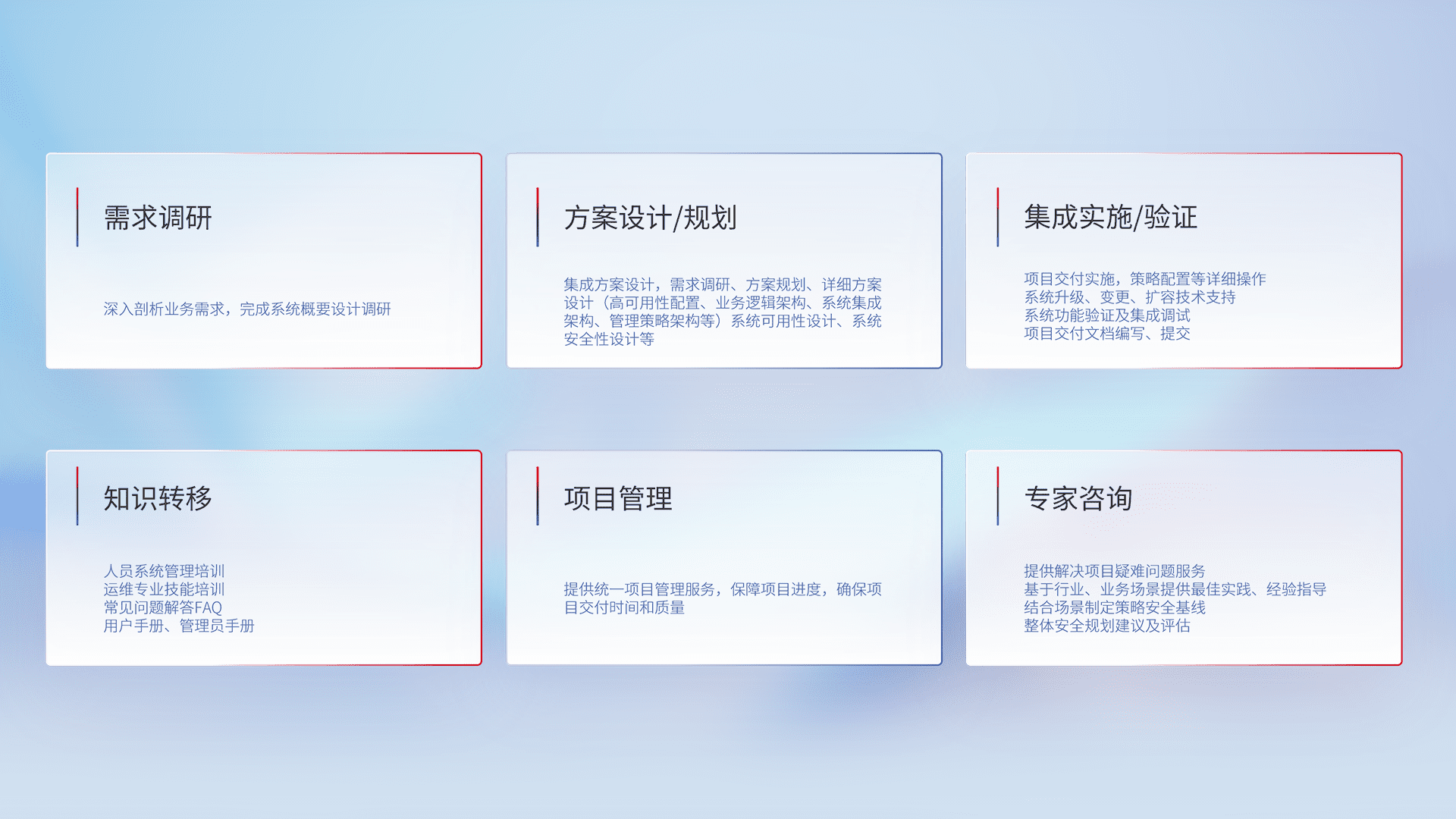 针对客户行业特性,,,将宏观的安全战略和需求,,,通过专业的交付服务,,,,实现项目落地,,为客户提供标准规范的集成交付服务。。。